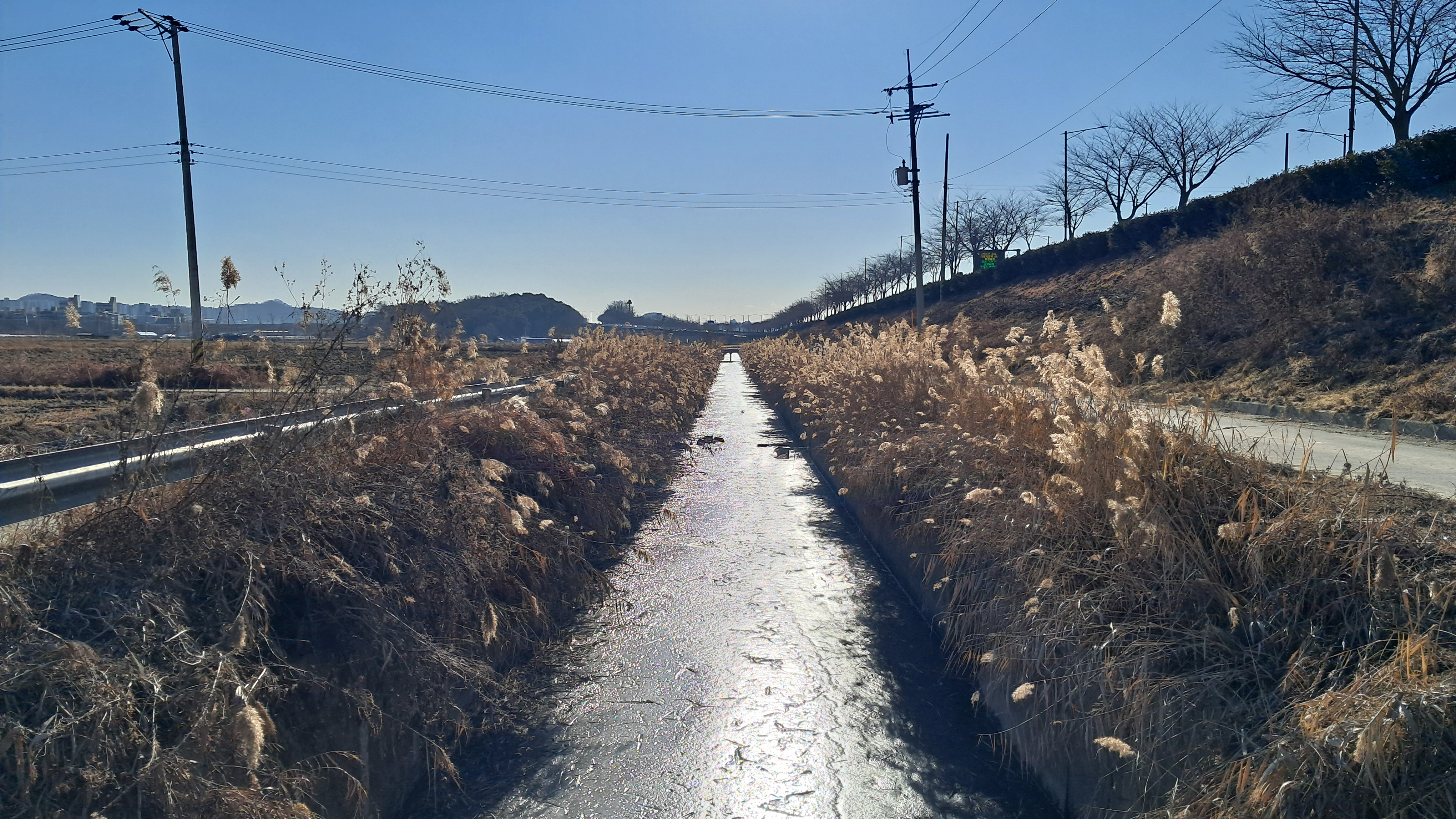 얼어붙은 농로의 수로는 태양빛이 비추어 눈이 부십니다.
