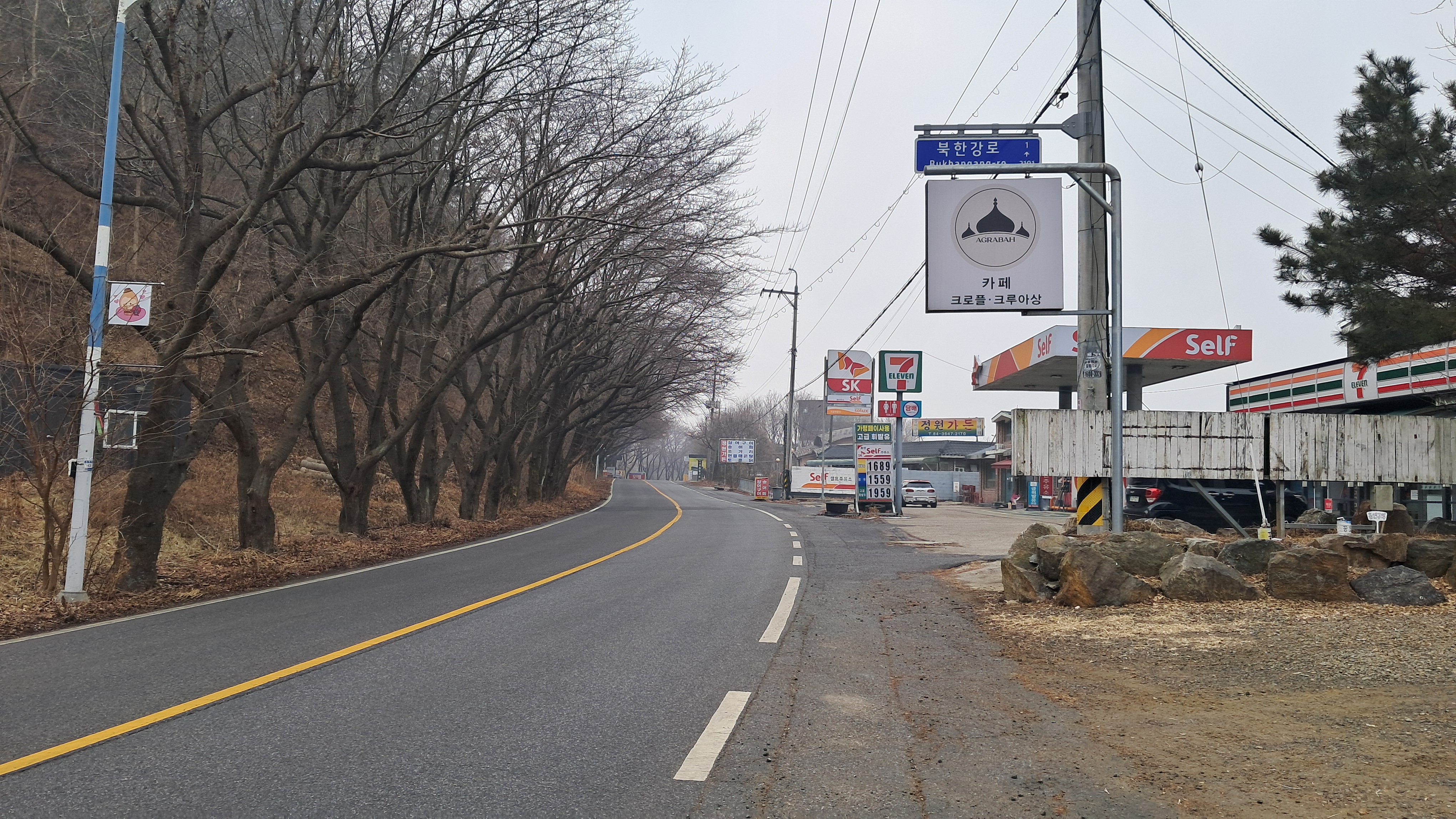 호텔, 주유소도 있고 펜션도 있고 음식점도 있는 도로를 따라 걸어갑니다.