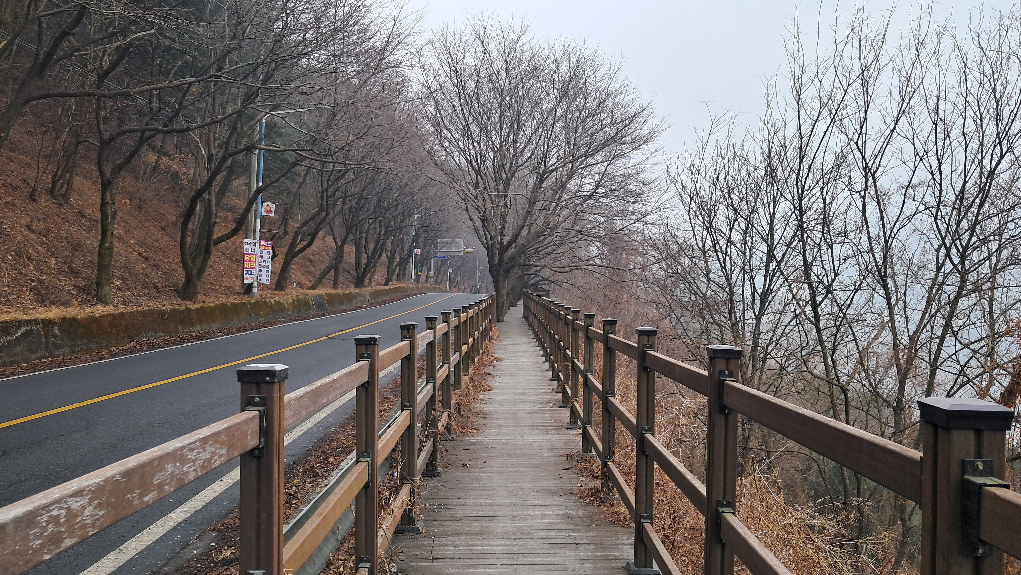 좁은 도로 옆으로 나무데크 길이 있어 차량에 신경 쓰지 않고 걸어갈 수 있습니다.