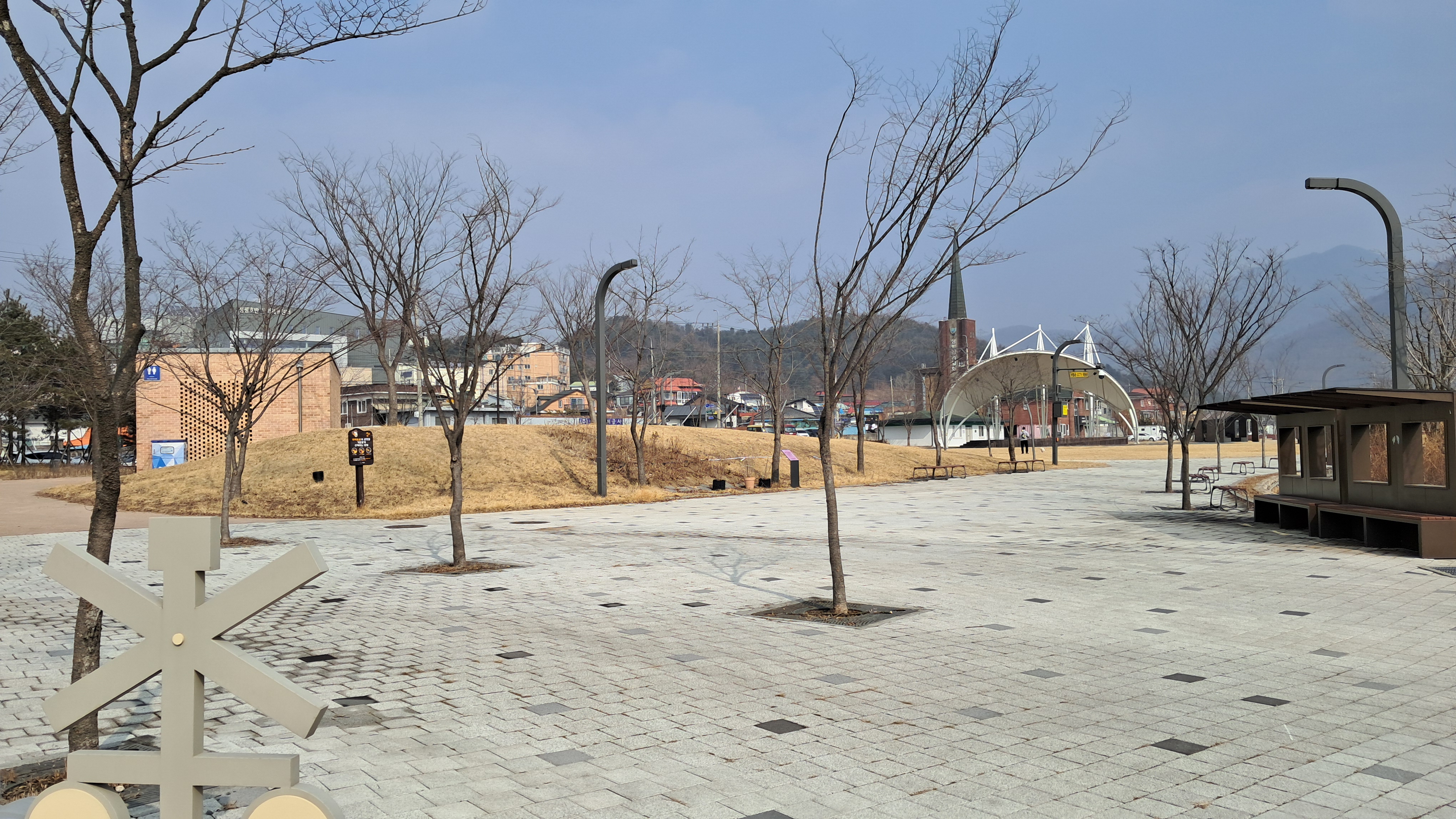 공원화된 공간에 몇 가지 조형물과 의자들이 있는 쉼터가 있습니다.