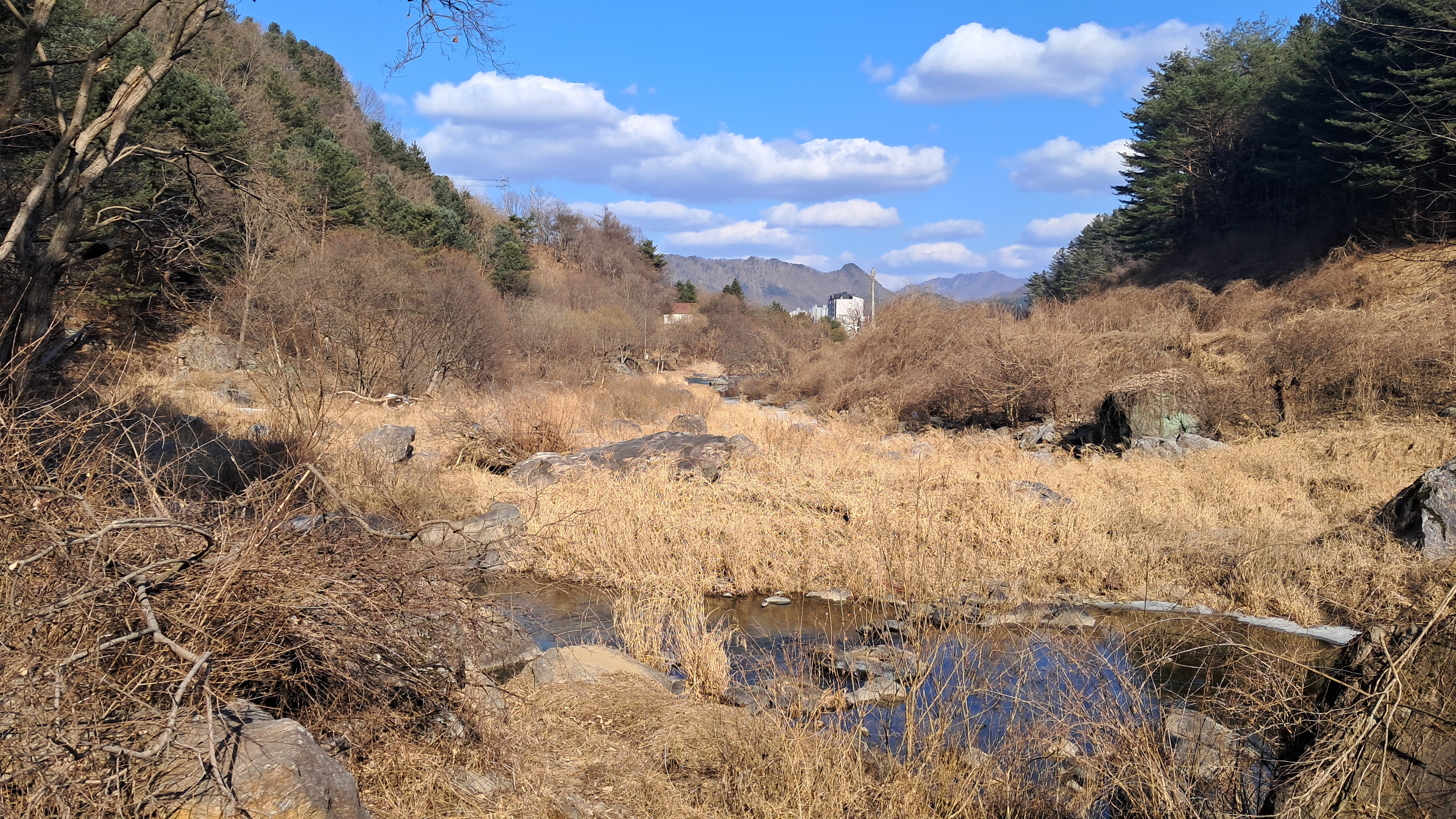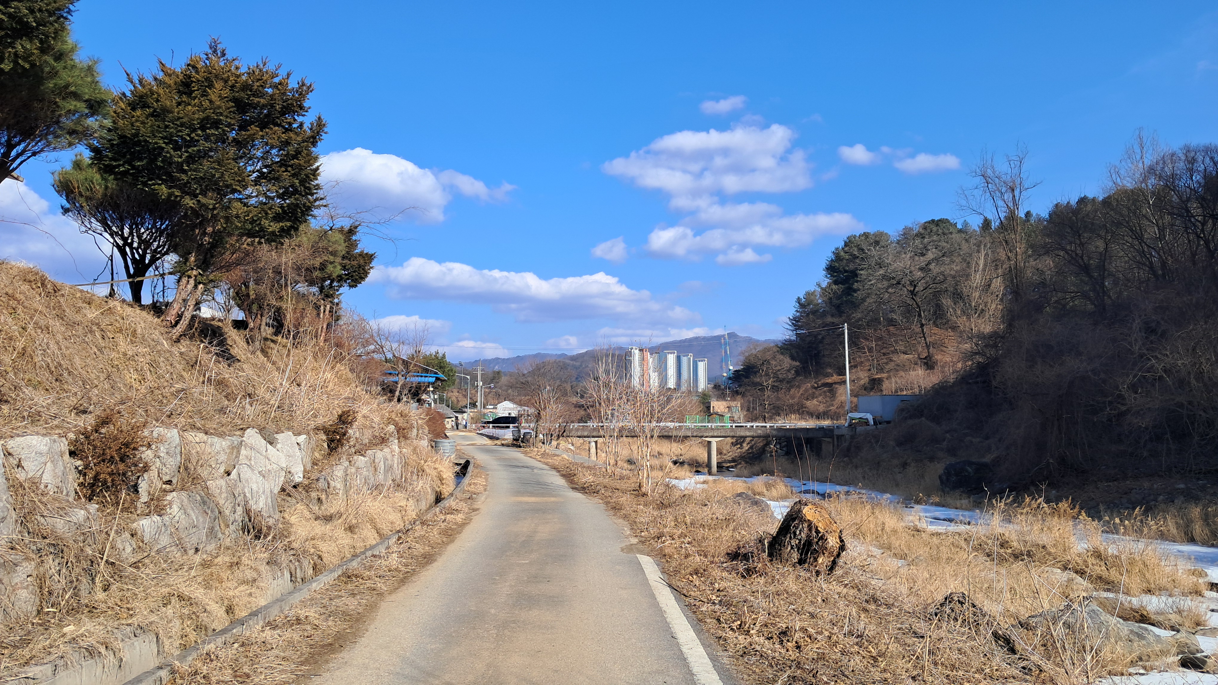 초등학교를 지나서 조금 더 걸어가면 하천변에 도달하게 됩니다.