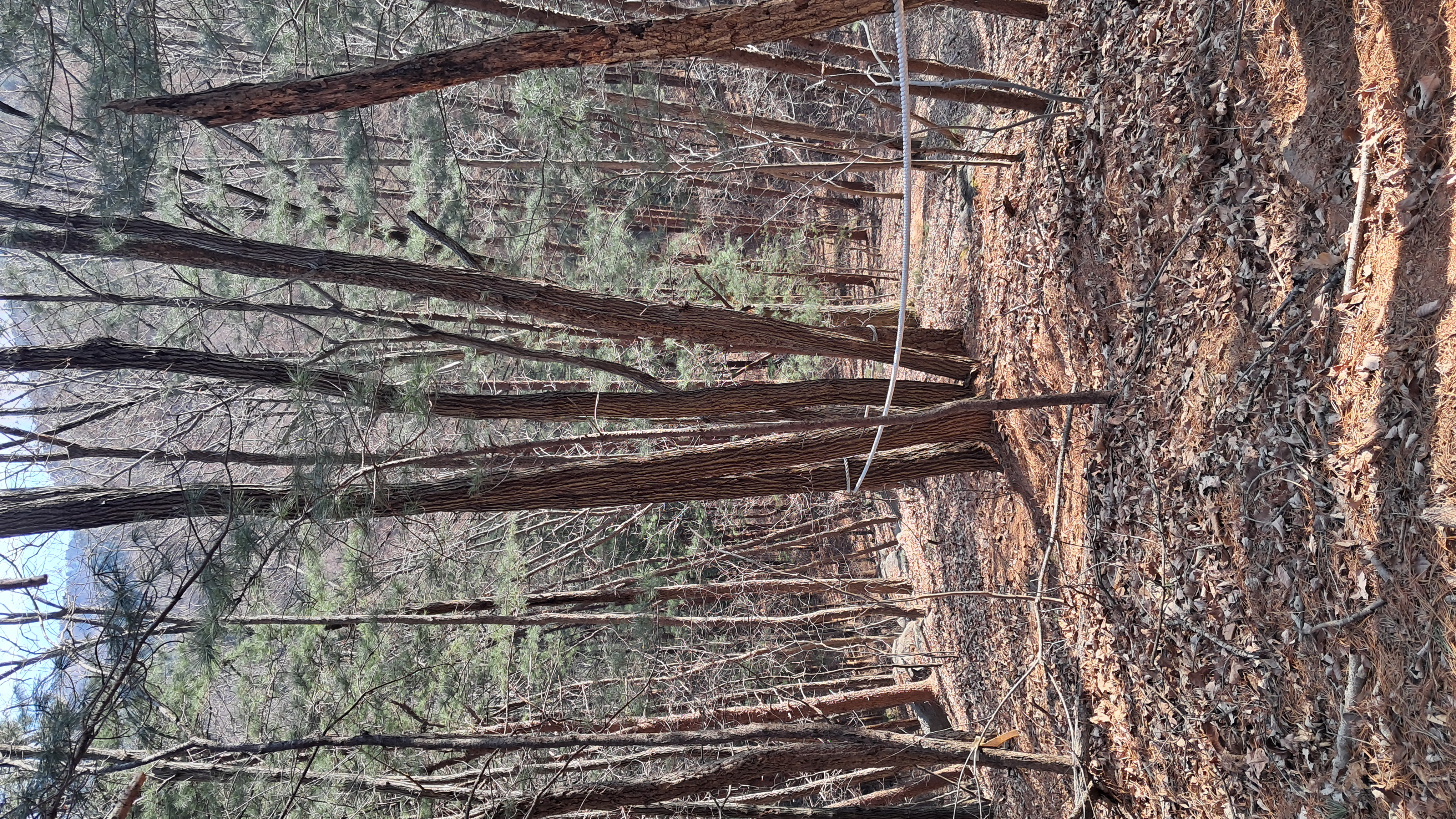다만 임도가 보이는 끝 무렵에 오래되어 글씨의 흔적도 없는 바랜 안내띠가 있었습니다.