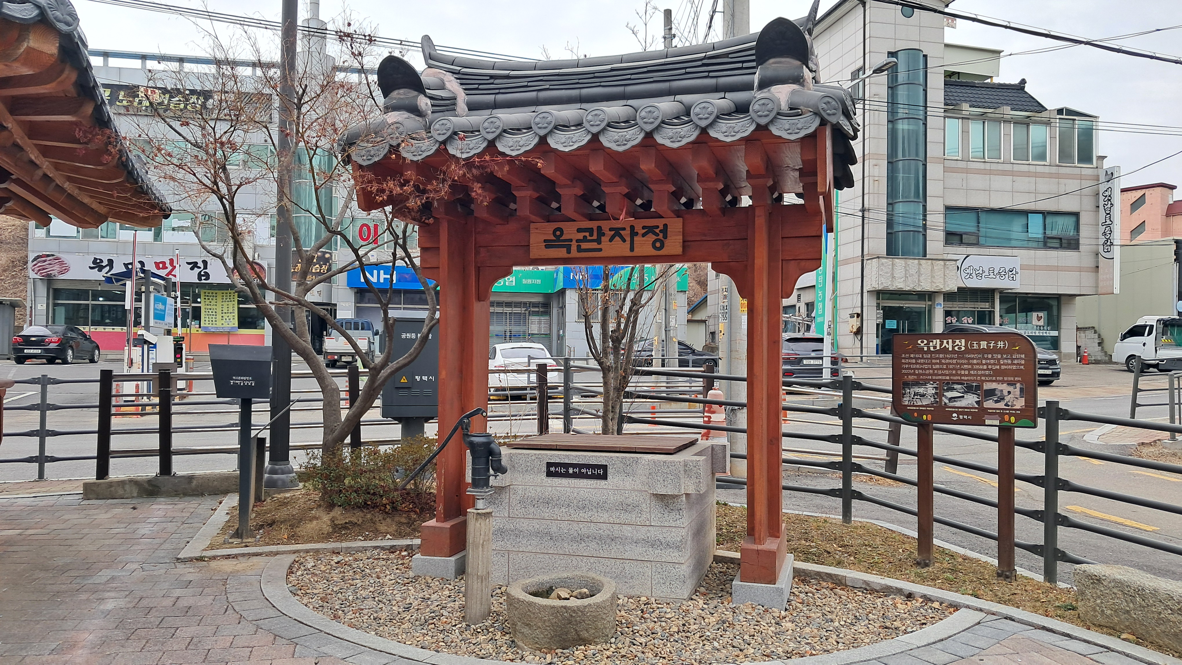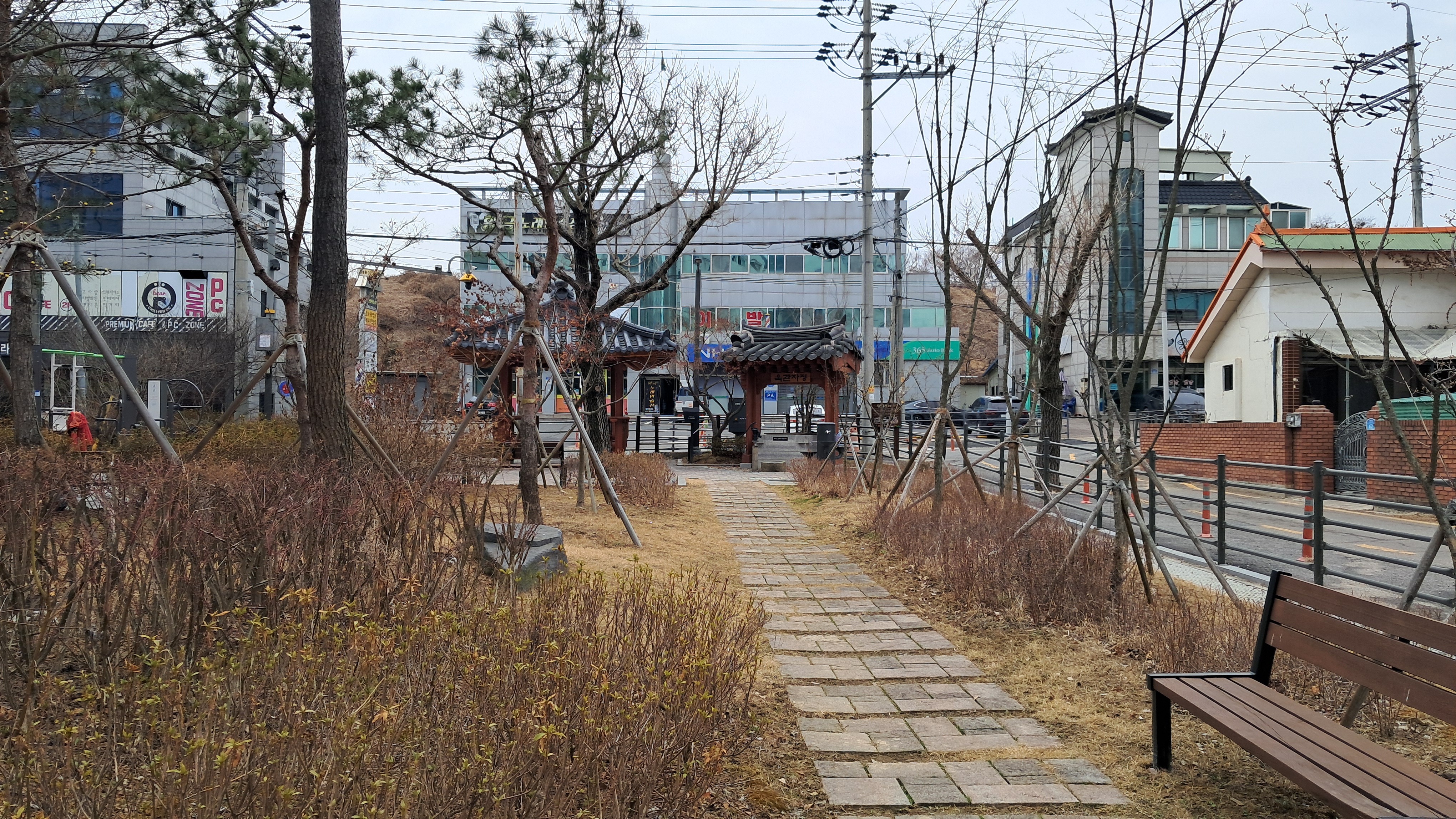 작은 공원 안에 기와로된 작은 구조물이 보입니다.