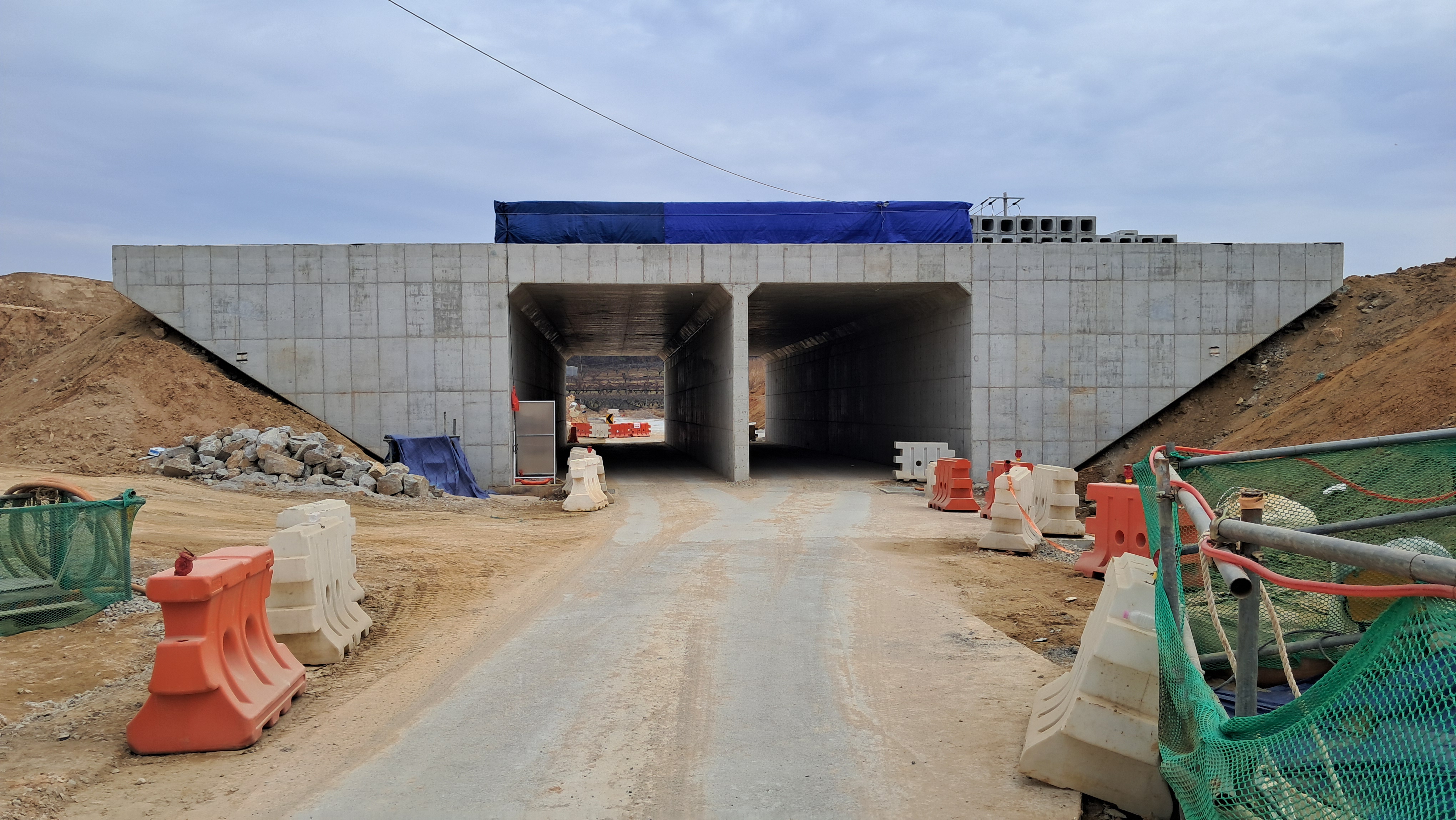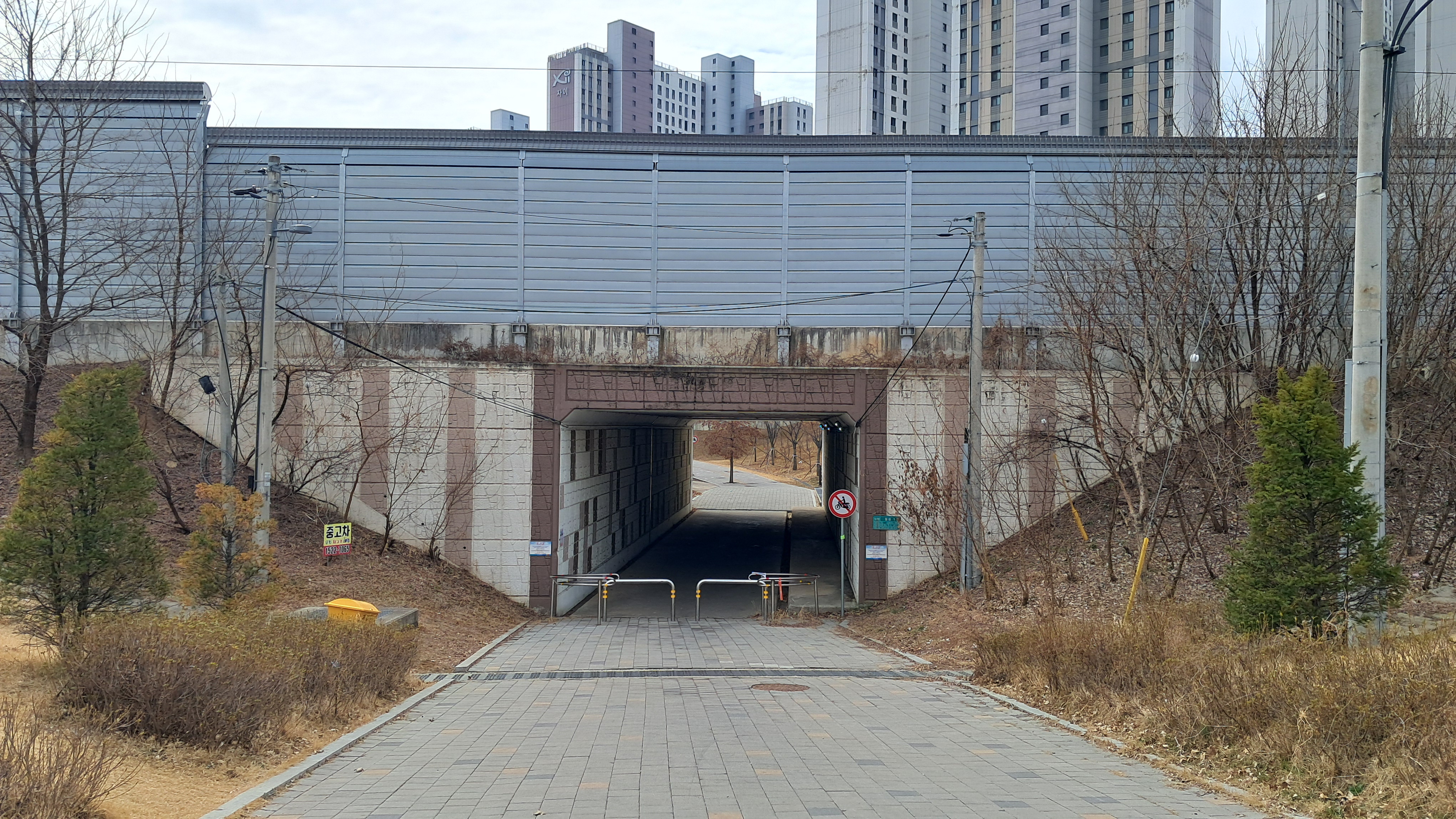 도로의 끝에서 좌측 굴다리를 통과합니다.